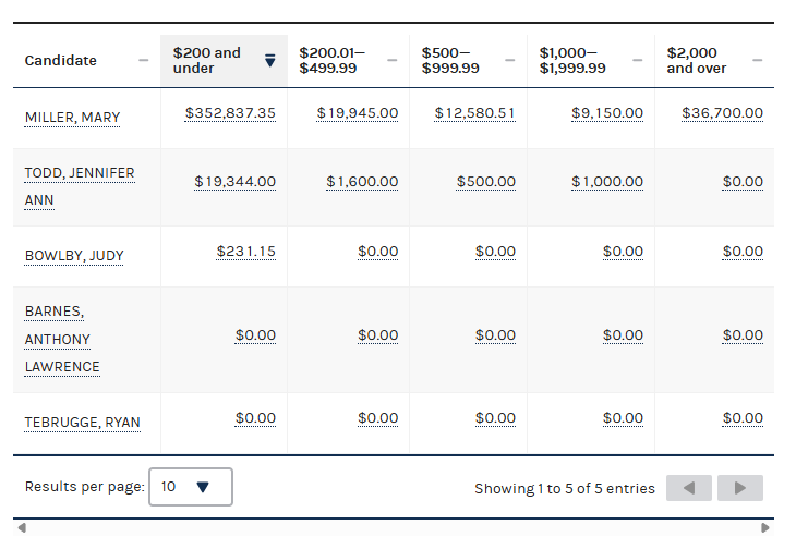 - Unsigned (February 3, 2020). “Mary Miller Raises Over $165,000 She Raises More Than Entire Primary Competition Combined”. RiverBender.